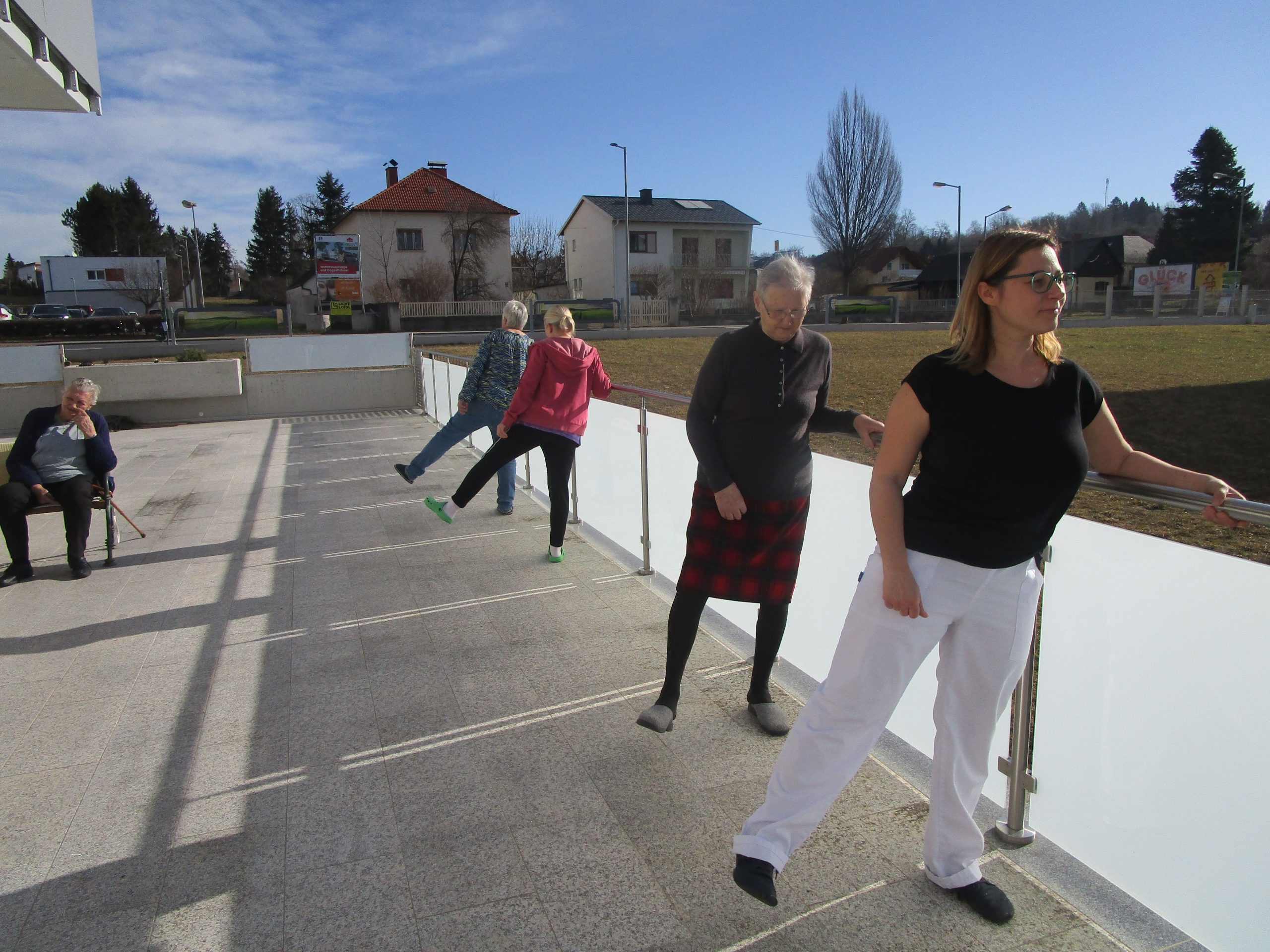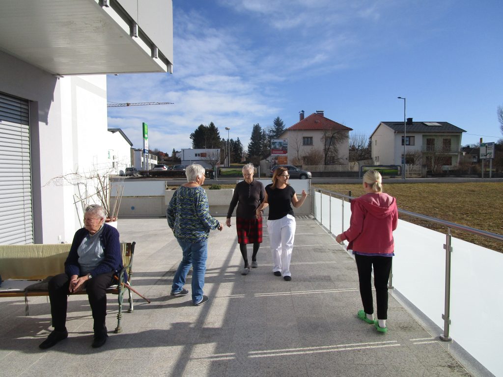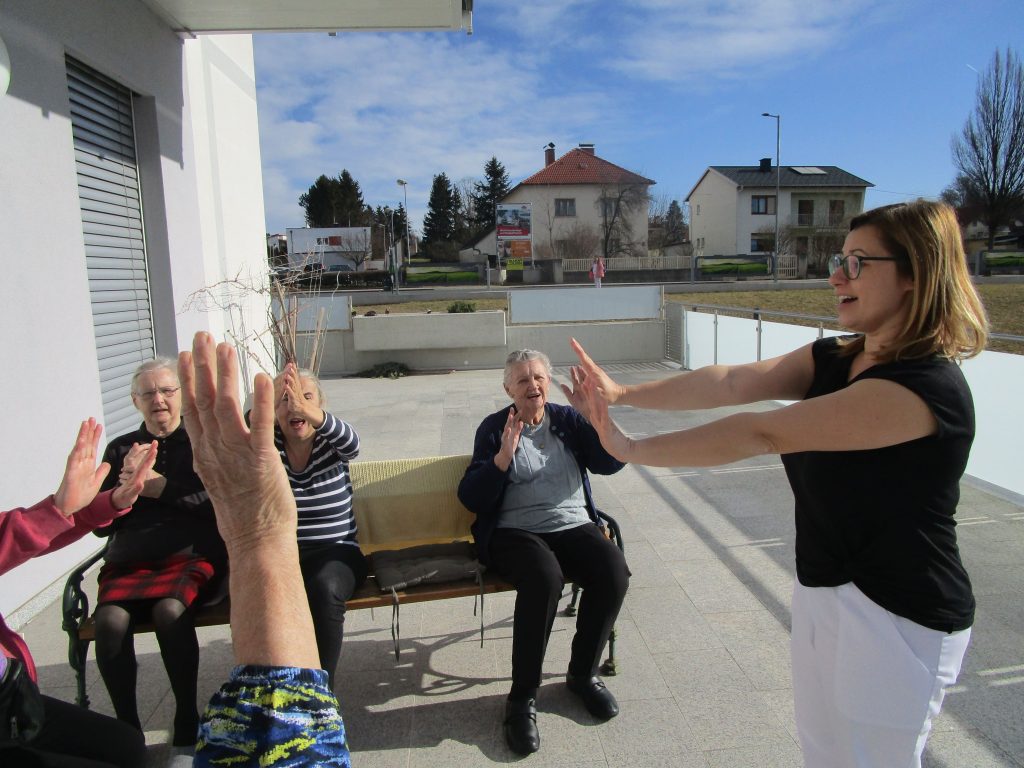 Nach dem schönen Wetter letzte Woche ging es auch für unsere Tagesgäste auf die Terrasse, um Bewegungseinheiten zu machen. Es wurden Tanzübungen ausgeführt und Übungen zum Gleichgewicht gemacht. Am Schluss wurde noch ein Sitztanz einstudiert.