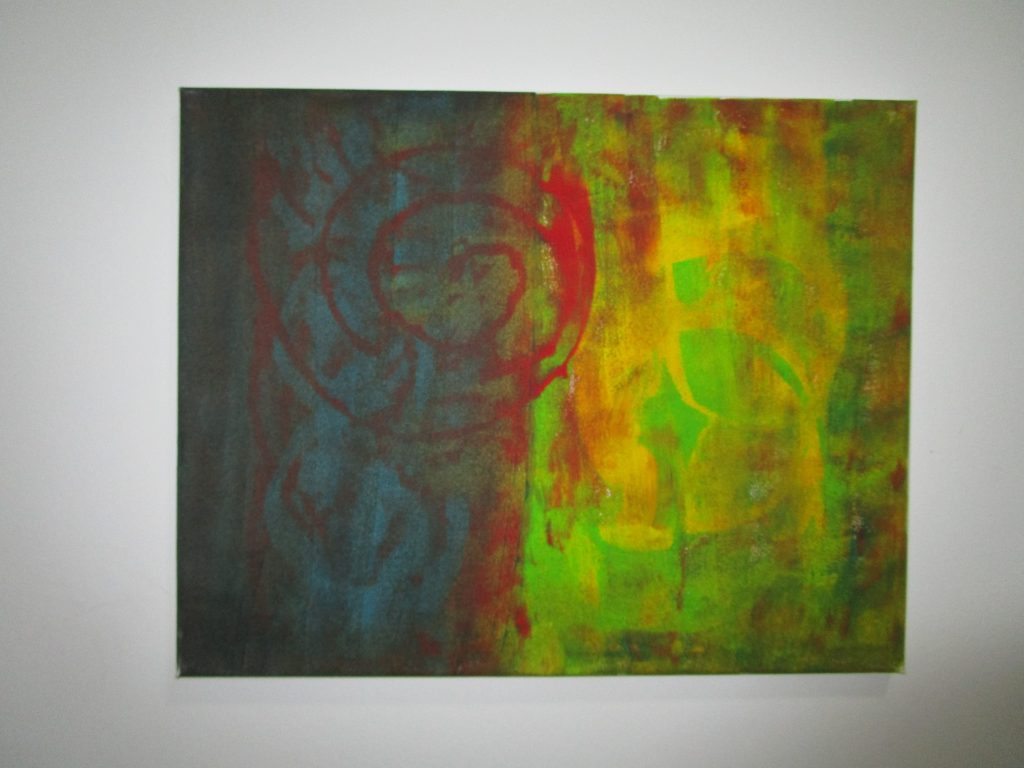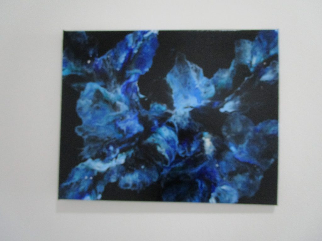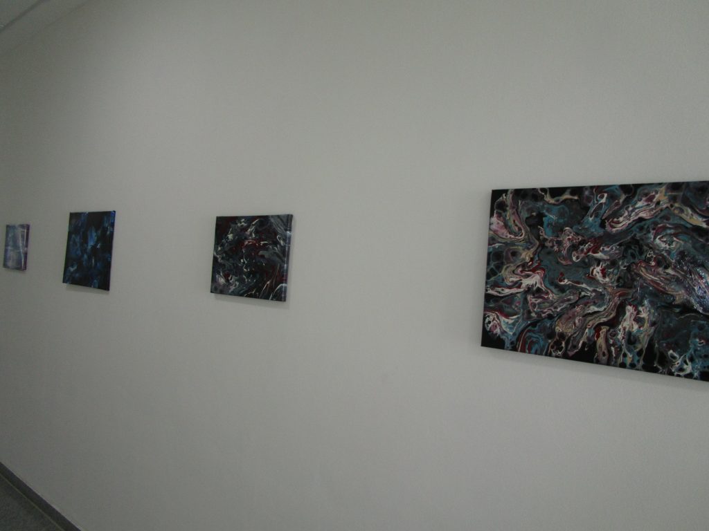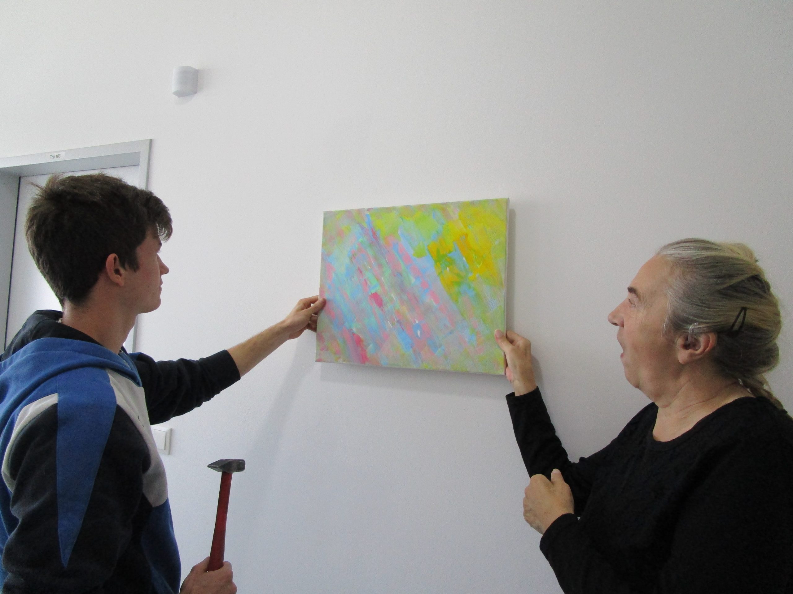 Die weißen Wände im Gang im Betreuten Wohnen wirten kahl, also wurden die Wände genutzt, um eine Kunstgalerie zu erschaffen. Eine Galerie zeigt zeitgenössische Werke, die sich mit einem Thema auseinandersetzten. In diesem Fall malten die Tagesgäste und einige Bewohner:innen des Betreuten Wohnen abstrakte Bilder auf kleinen Leinwänden. Die farbenfrohen Kunstwerke wurden aufgehängt und verzieren nun den Gang.